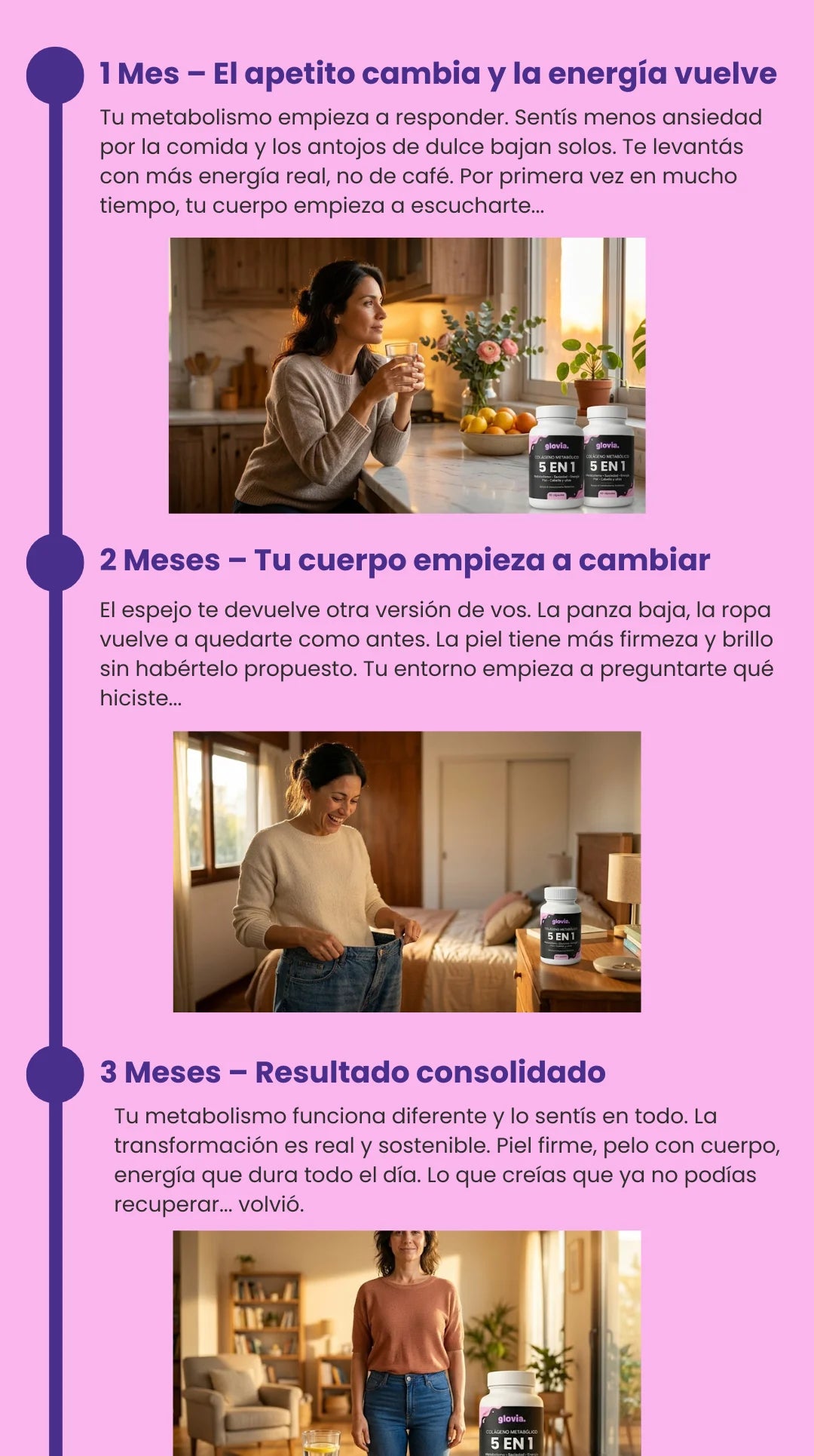 GLOVIA está pensado para mujeres adultas que buscan acompañar su metabolismo, sumar colágeno a su rutina diaria y sentirse con más energía sin recurrir a dietas extremas.